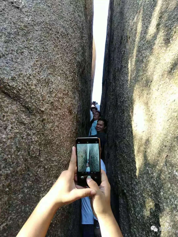 越往上爬路途越狭窄,但视野也越发开阔,大家相互拉扯加油打气陆续抵达山顶。在山顶合影留恋,颇有一种“会当临绝顶,一览众山小”的韵味。最后,大家集体童趣了一把,乘坐长长的“滑滑梯”来到东山门结束了第一天的行程。