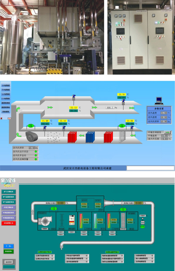 其中组合式空调器配置形式由我公司自行设计,约克公司定制;积风箱由我公司自行设计与定制;进气管道我公司选用卫生级的U-PVC管;控制部分由我公司自行设计,选用西门子PLC-200控制系统,控制柜自行组装,并编程调试。