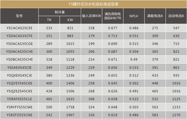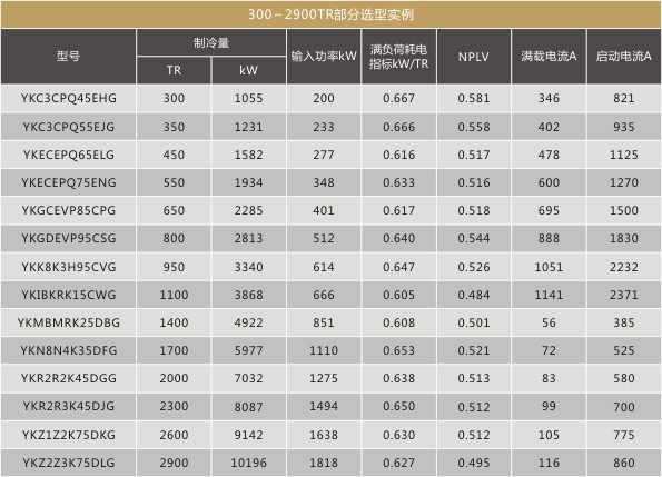 ▶ 上述选型表参数根据冷冻水进/出水温度12/7℃,冷却水进/出水温度32/37℃,换热器都为2流程,起动方式为星三角。