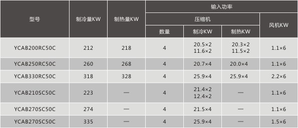 ▶ *YCAB200RC/210SC容量控制级数有多种可能,除上表的容量控制级数外还可能是100-81-50-31或100-69-38-19或100-81-62-31。