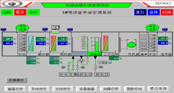 在汽车生产厂涂装车间中,因为环境的温度和湿度对涂层质量有很大的影响,控制不当会使涂层产生种种弊病。生产流水线上的喷漆室室内环境要求洁净、恒温恒湿,这对汽车表面的漆膜质量起着至关重要的作用,这就要求供给喷漆室的空调机组运行可靠,对其出口和喷漆室室内的温度和湿度能进行精确的控制。